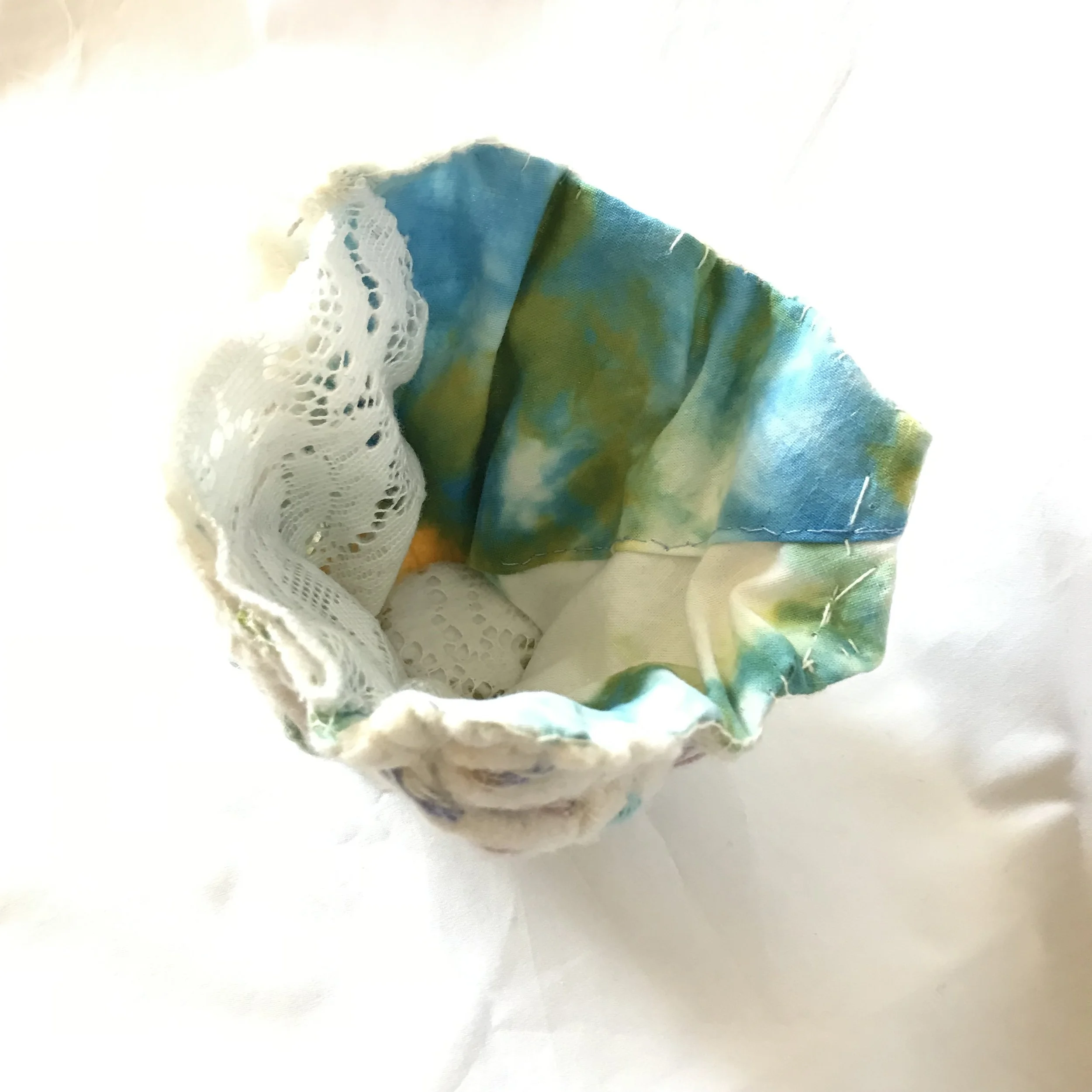 This one was a piece of left over silk quilt batting. It was a rectangle and I stitched in some gathering thread and gathered it into a puff. I stitched around the base with blanket stitch to make a foot base to stand on then after more gathering stitched the side seams and around the top edge. The inside is a lovely scrap of hand dyed cloth I did ages ago and have always loved because of its clear blue sky look. and attached a bit repurposed lace from a garment.