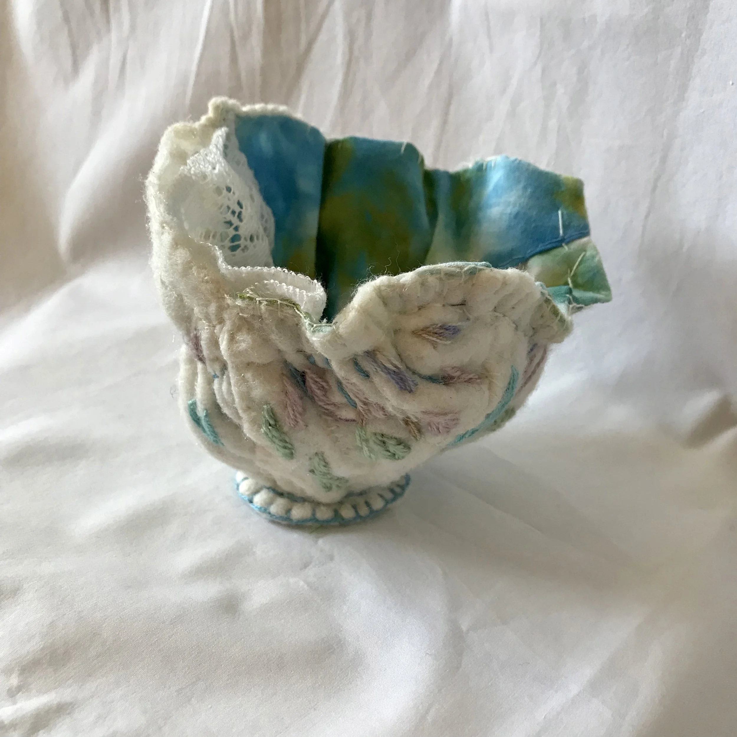The embroidered stitches were simply done following the contours of the peaks and valleys made by the gathering. Because it was so soft and small it was easy to work with and it truly is cup size as it will sit in my upturned palm.
